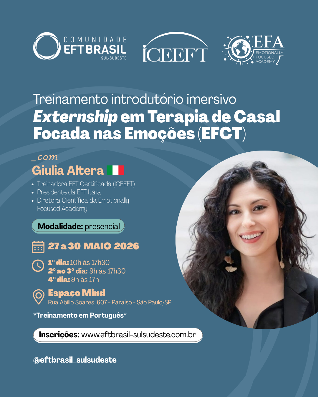 Treinamento oficial chancelado e certificado pelo International Centre for Excellence in Emotionally Focused Therapy (ICEEFT) e promovido pela Comunidade afiliada EFT Brasil Sul-Sudeste.